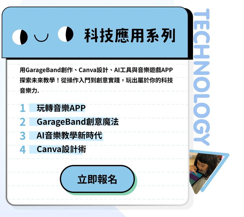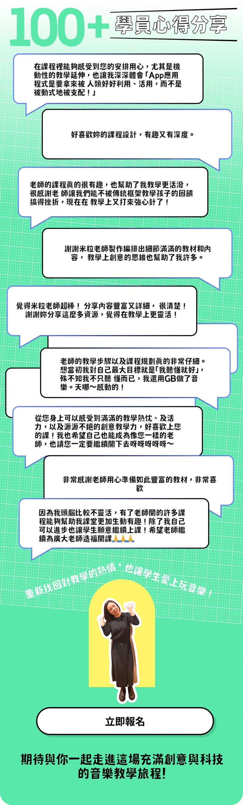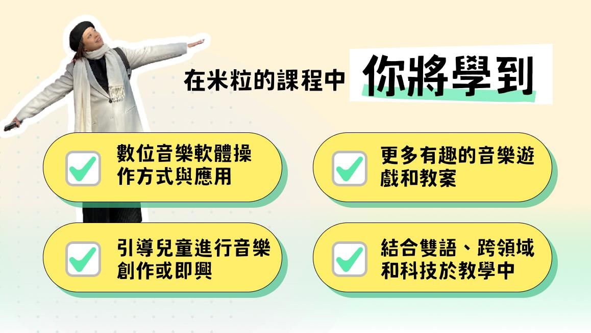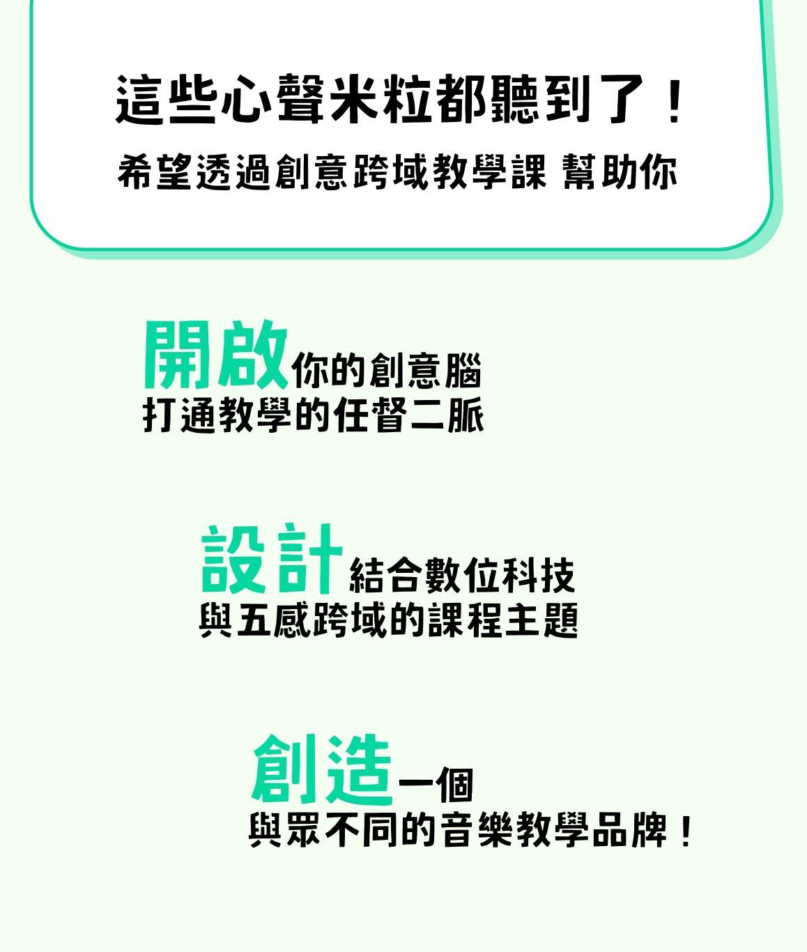 致力於結合創意、數位科技、 義大利瑞吉歐教學法,以及跨領域於教學中,希望讓孩子從聆聽&探索中創造音樂,並愛上音樂!